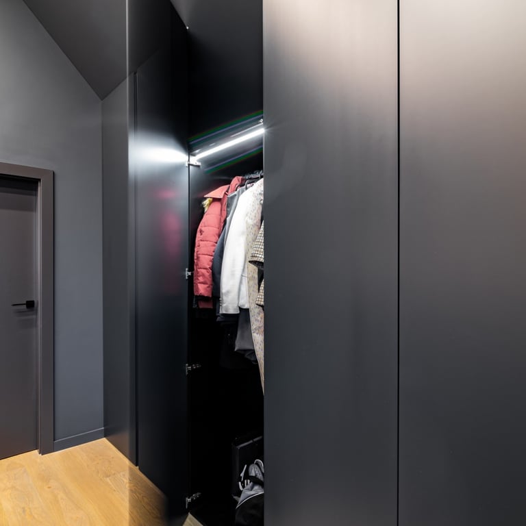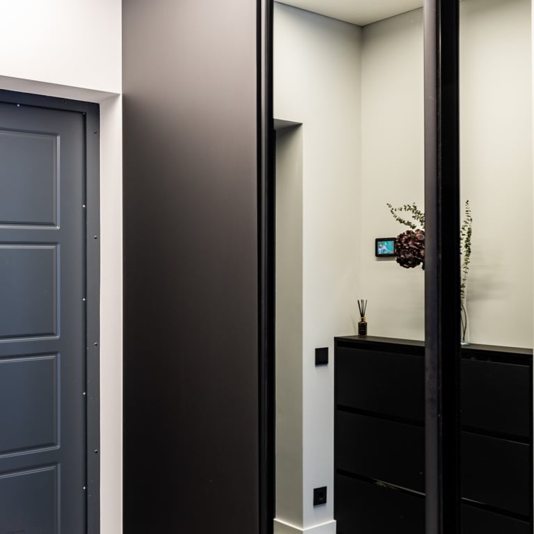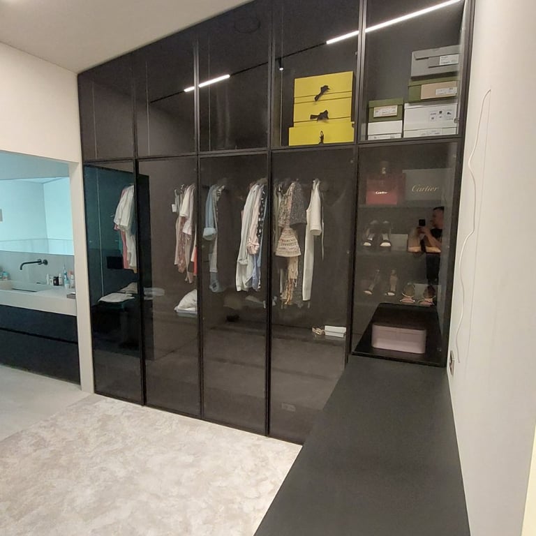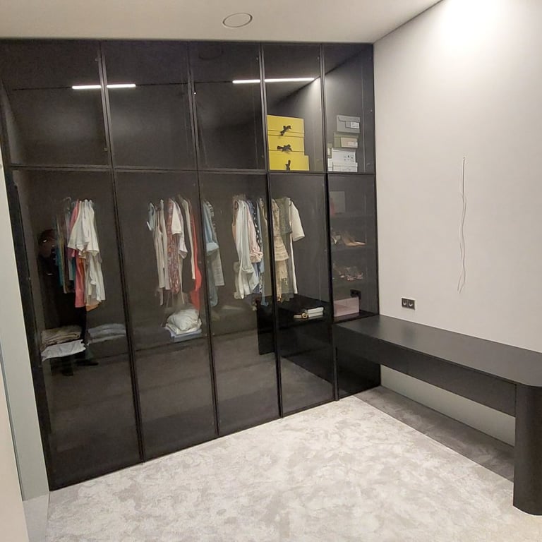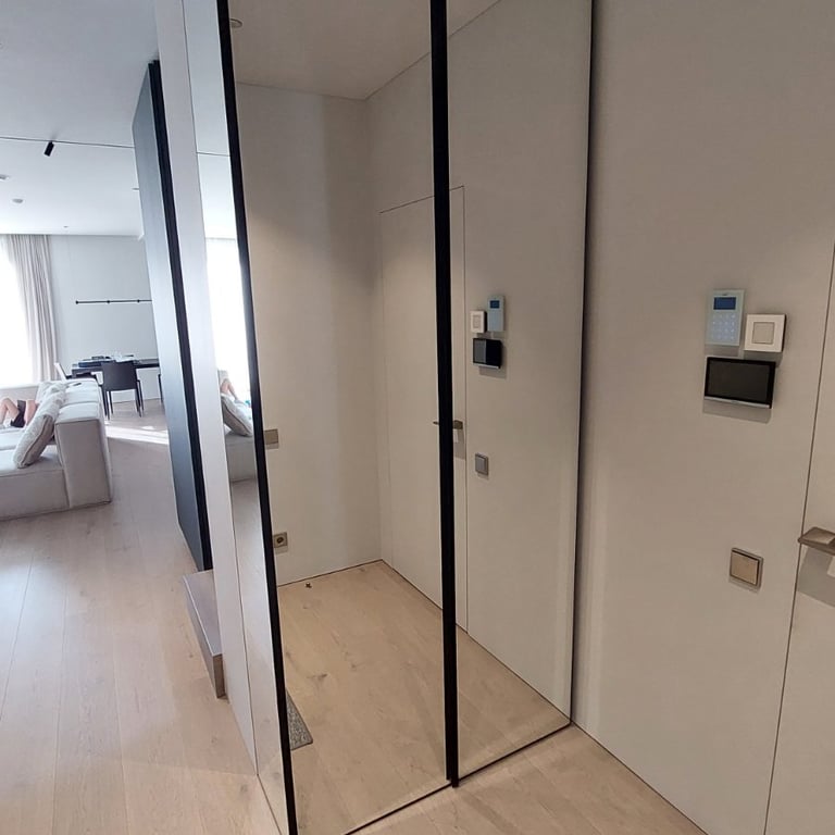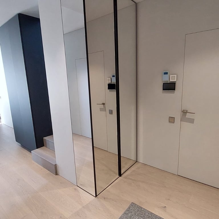 Rūbų spintos su stiklinėmis/veidrodinėmis durimis.