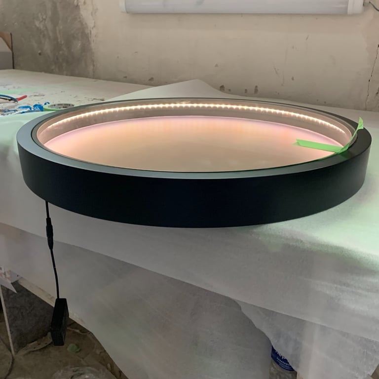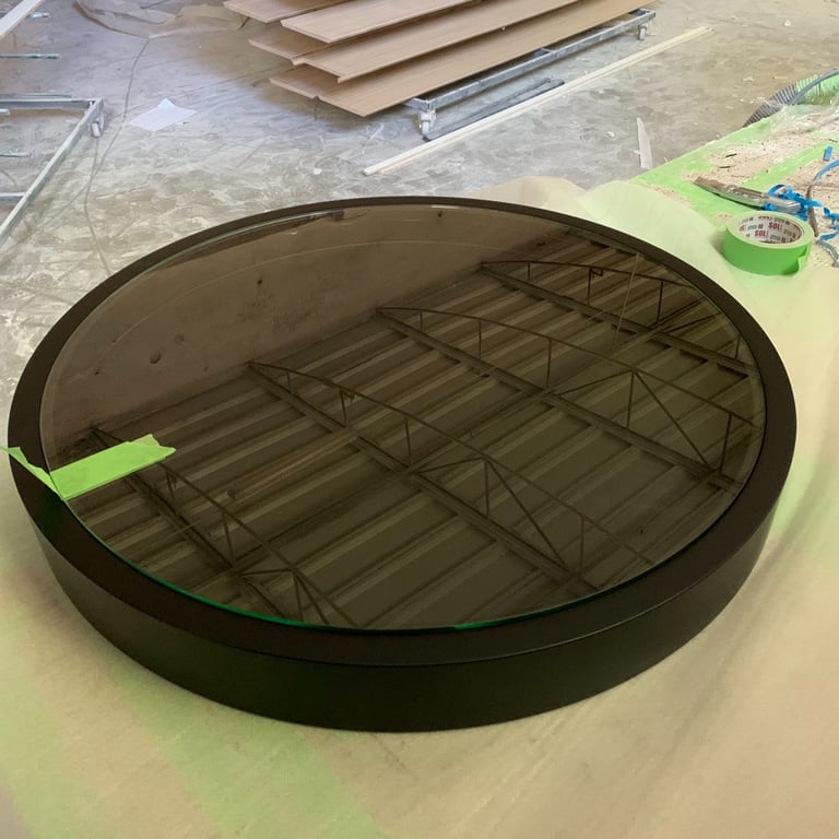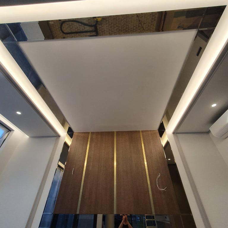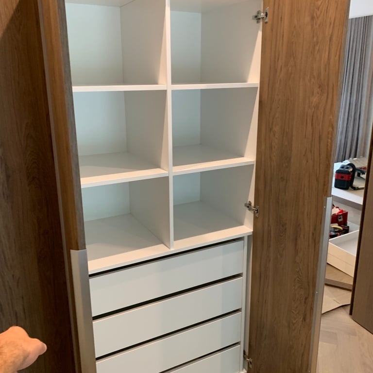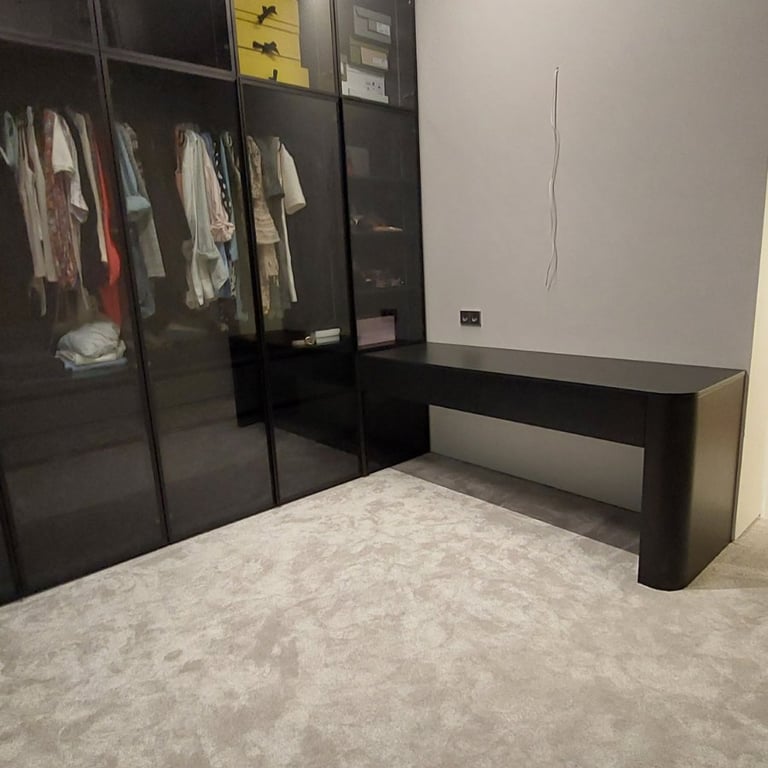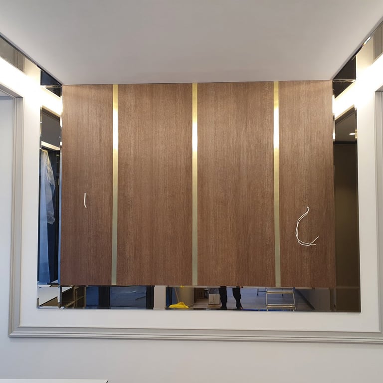 Rūbų spintos su stiklinėmis/veidrodinėmis durimis.